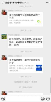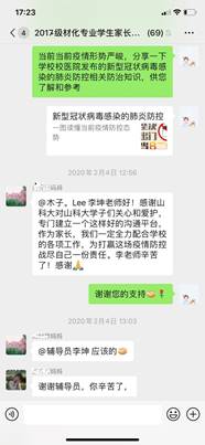 加强学校与家庭联动,发挥亲情教育的积极作用。学院建立了完善的学生家长微信群,发挥网络优势开展工作。2月4日,学院发出《致Beat365唯一官方网站全体家长、同学倡议书》,呼吁家长、学生做好自我防护,高效利用寒假。学院各年级辅导员在家长群内分享防疫知识,与家长互动交流;向家长寄送成绩单,共同关注学生成长;主动与学生家长进行电话沟通,加强教育关怀,形成了良好的家校沟通氛围,获得了学生家长的高度认可。