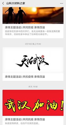 同时,学院也充分利用线上新媒体平台,在学院易班、官方微信、qq、抖音等平台发布一系列疫情防控知识、志愿者先进典型报道、前线加油祝福等信息的推送,为同学提供了丰富的线上文化资源。