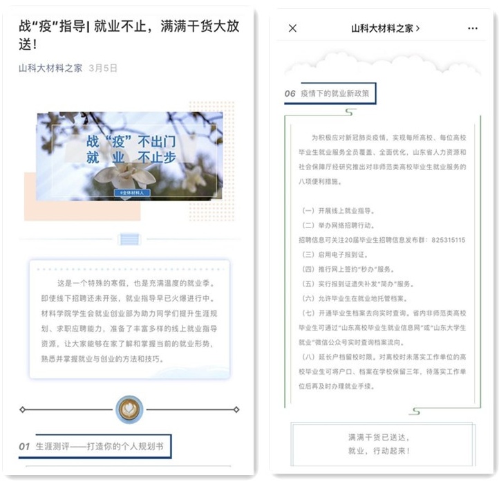 分类施策,稳步推进就业工作。开展疫情防控工作的同时,重点跟进毕业生就业指导、考研指导。辅导员主动与每位学生联系,毕业设计指导老师和就业指导老师合二为一重点对接,定期了解毕业设计进展和就业动向。通过微信公众号、qq群等推送就业相关信息,高效利用学校大学生就业网等网站资源,为毕业生同学提供了一站式就业服务。学生党员、学生干部等发挥先进带头作用,与考研、就业有困难的同学结对,发挥朋辈帮扶作用。
