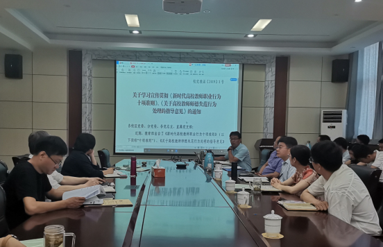 申兆亮结合《新时代师德规范》、《新时代高校教师职业行为十项准则》、《关于高校教师师德失范行为处理的指导意见》《Beat365唯一官方网站教师师德考核办法》等师德师风建设相关文件对全体教职工进行宣讲,重点从思想政治方面、学术道德方面、教育教学方面、生活行为方面、廉洁自律方面等讲解了Beat365唯一官方网站师德负面清单,并结合违反高校教师职业行为十项准则典型案例对师德失范行为处理进行了深入剖析。
