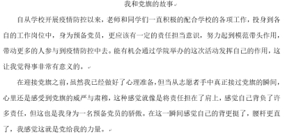 疫情期间学院还举办“我和党旗的故事”征文活动,鼓励参加“接力传党旗,战“疫”我先行”志愿活动的宿舍或个人积极投稿,以文字凝聚抗疫信念、传递抗疫力量。