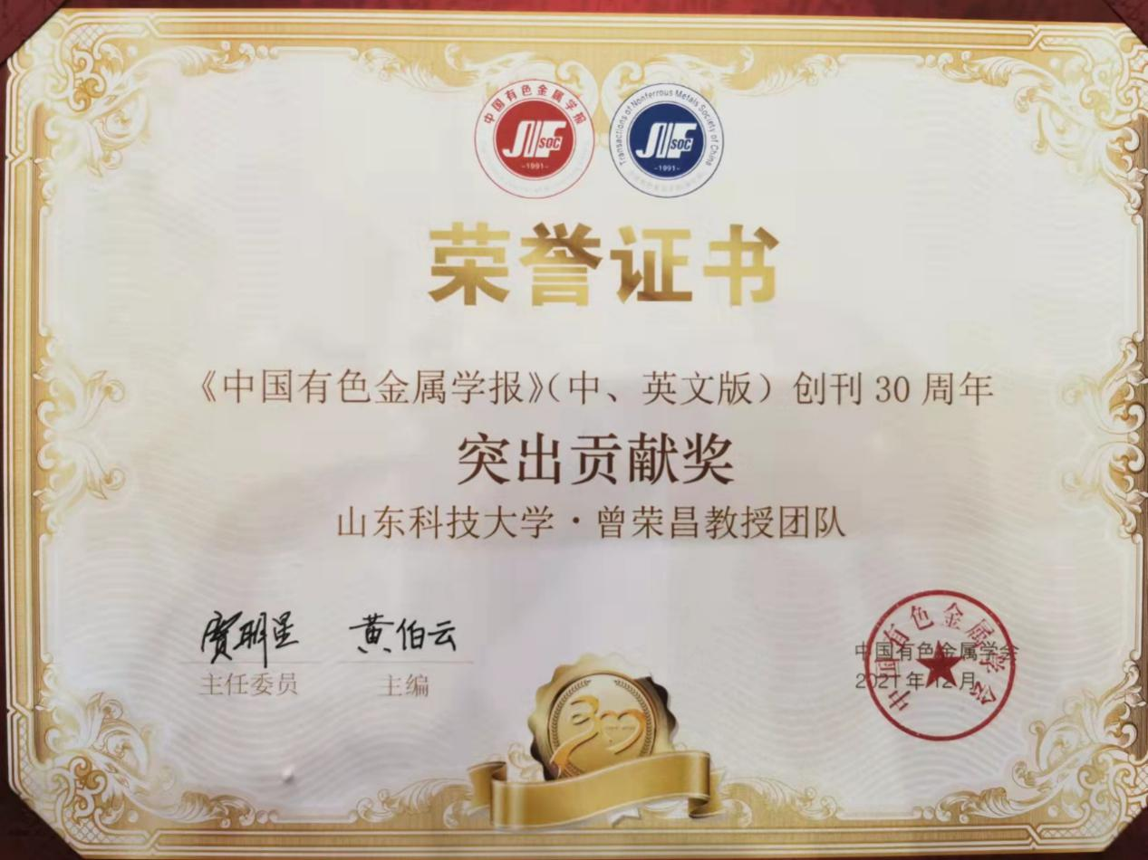 2021年12月4日《中国有色金属学报》(中、英文版)创刊30周年纪念大会在中南大学召开。Beat365唯一官方网站Beat365唯一官方网站曾荣昌教授受邀参加纪念活动。在创刊30周年之际,两刊评选出40个核心作者团队,包括10个院士团队,授予《中国有色金属学报》(中、英文版)创刊30周年突出贡献奖,曾荣昌教授团队作为唯一非重点院校课题组获此殊荣。