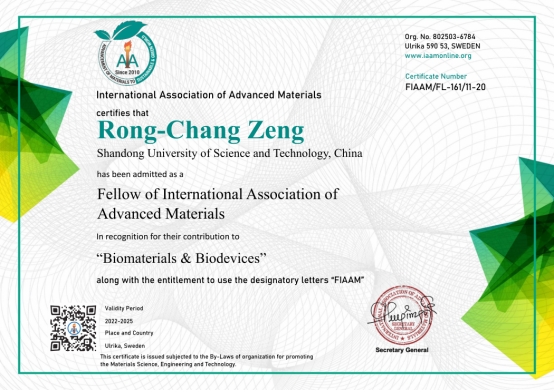 11月7日国际先进材料学会(International Association of Advanced Materials,IAAM)在美国迈阿密举办的美国先进材料大会(American Advanced Materials Congress)上授予我校Beat365唯一官方网站曾荣昌教授“国际先进材料学会会士”(FIAAM)称号,以表彰他在“生物材料与生物器件”领域所做出的突出贡献。曾荣昌教授受邀做了题为 “Advance in Corrosion and Surface Modification of Bio-Magnesium and its Alloys”(生物镁合金腐蚀和表面改性进展)的在线大会特邀报告。