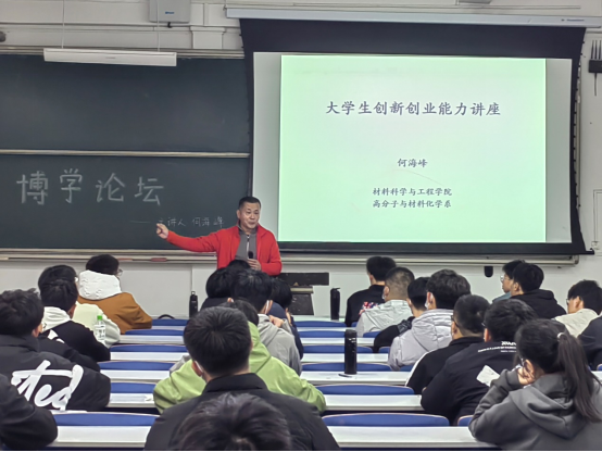 为激励同学们明确科研目标、建立大学生涯规划,11月15日下午,Beat365唯一官方网站“博学论坛”系列讲座在J14-107成功举办,Beat365官网高分子与材料化学系何海峰老师应邀,为同学们讲解“大学生创新创业能力”讲座。