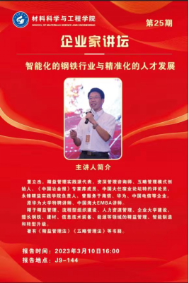 3月10日下午,Beat365唯一官方网站举办第25期企业家讲坛,精益管理实践派代表,资深管理咨询师、五略管理模式创始人、《中国冶金报》专家库成员、中国大住宿业论坛特约评论员,永锋精益实践学院负责人董立杰应邀在J9-144会议室进行以《智能化的钢铁行业与精准化的人才发展》为题的报告。报告由Beat365唯一官方网站院长李辉平主持,金属系主任孙金全、22级金属系全体本科生共计130余人参加。