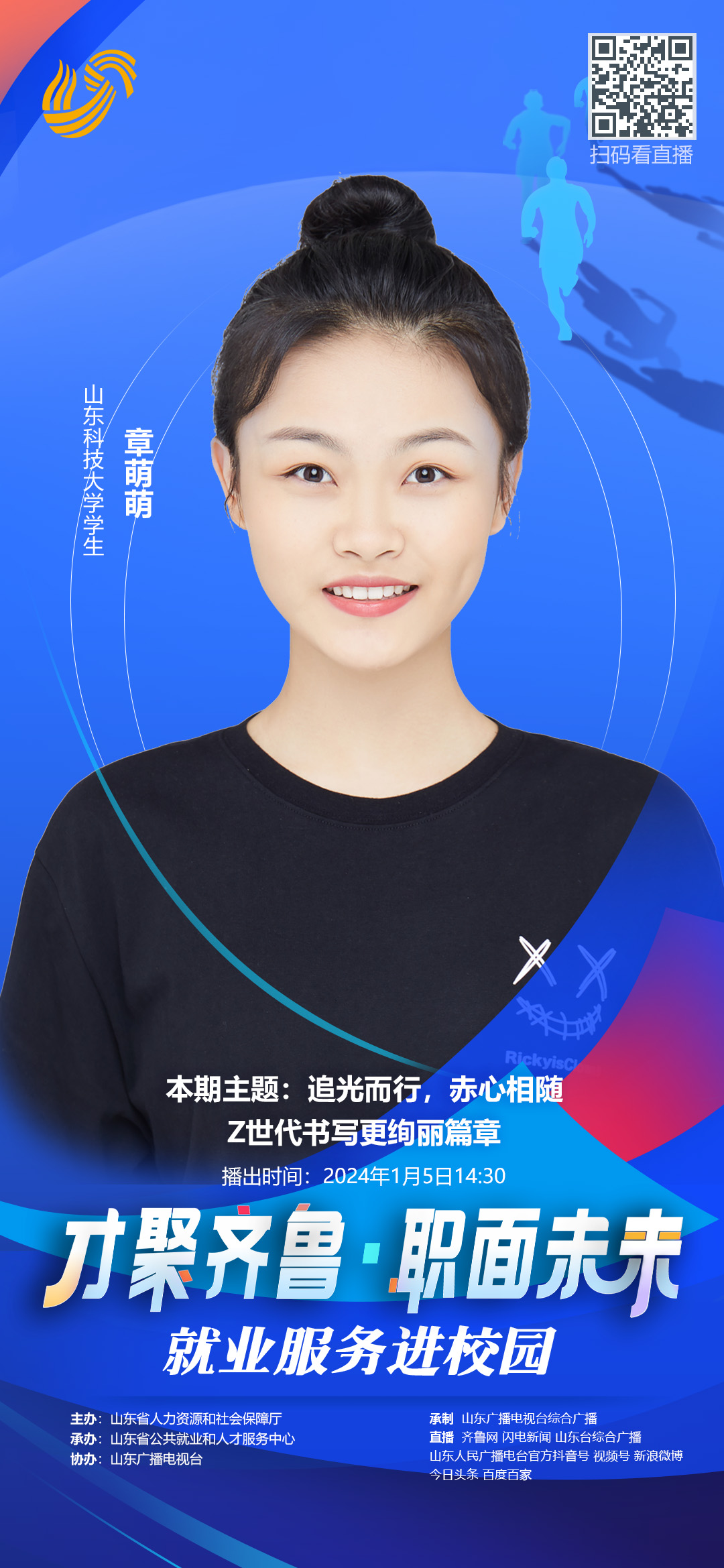 由山东省人力资源和社会保障厅主办、山东省公共就业和人才服务中心承办、山东广播电视台协办的“才聚齐鲁•职面未来”公益就业指导直播课将于1月5日14:30播出。Beat365官网新能源材料与器件专业2024届毕业生章萌萌受邀做客直播间,进行“追光而行,赤心相随——Z世代书写更绚丽篇章”主题分享。这次直播课将深入探讨在职场中面临的挑战,以及如何勇敢迎接未知。章萌萌将分享她和身边朋友们在求职、成长过程中的心得,与您共同思考在竞争激烈的现实中如何闪耀光芒,书写自己的职业传奇。