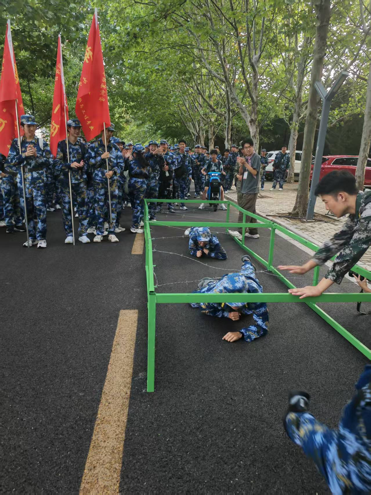 拉练队伍从科创园区田径场出发,扛旗的排头学生昂首挺胸,鲜红的旗帜在风中猎猎作响。同学们紧随其后,步伐整齐划一,清脆的歌声与嘹亮的口号声此起彼伏,迷彩身影如长龙般蜿蜒向前,沿途经学校东门、体育馆、家属区等地。10公里的路途,是体力的挑战,更是意志的淬炼——汗水浸透衣背,脚掌渐生酸痛,但无人停下脚步,大家相互鼓励,坚持前行,展现出极强的韧性。