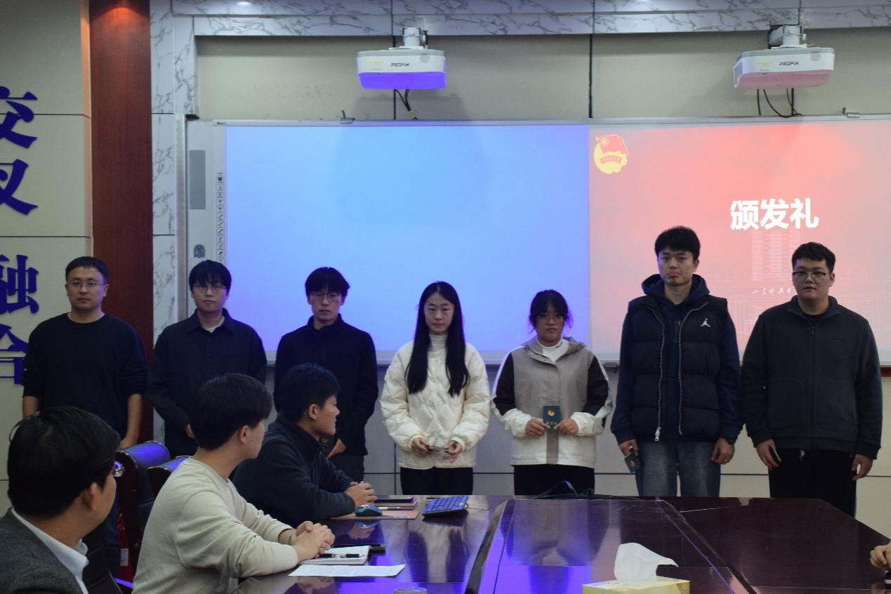 仪式在庄严氛围中拉开帷幕,全体人员起立高唱《中华人民共和国国歌》,激昂旋律筑牢肃穆基调;随后,石臻带领新团员学习《中国共产主义青年团章程》核心内容,明确团员责任使命;马韶霞宣读新发展团员名单;钟文建颁发团员证、许珍颖佩戴团徽,红色证书与闪耀团徽标志着新团员正式加入团组织;韩恒飞领誓,铿锵誓言展现新团员跟党走的坚定决心。