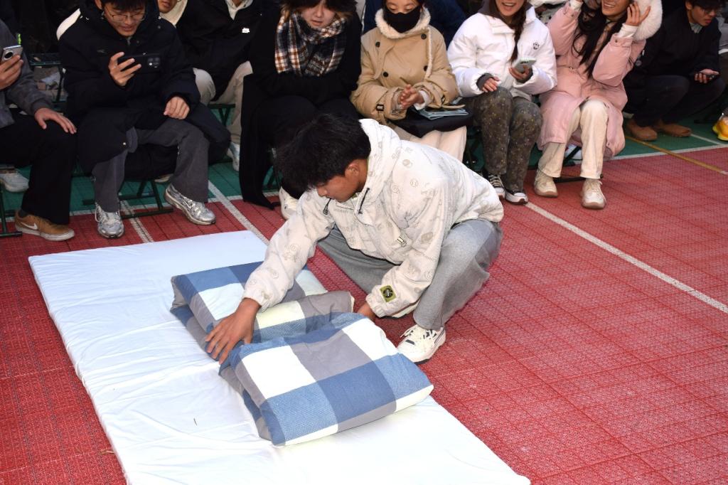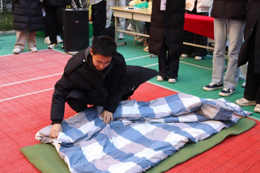 随后进行的叠被能手大赛,开展了“小试身手”“互帮互助一起来”“迎难而上”“班级趣味活动项目”四个项目,8支参赛队伍同台竞技。选手们动作利落、标准规范,将被子叠成整齐的“豆腐块”;拉拉队助威声此起彼伏,现场氛围热烈。经过多轮比拼,最终2025级金属二班斩获一等奖,高分子三班、金属三班获二等奖,高分子一班、金属一班、新能源二班获三等奖,高分子二班、新能源一班获优秀奖。