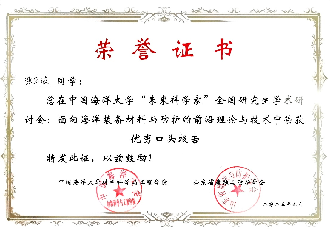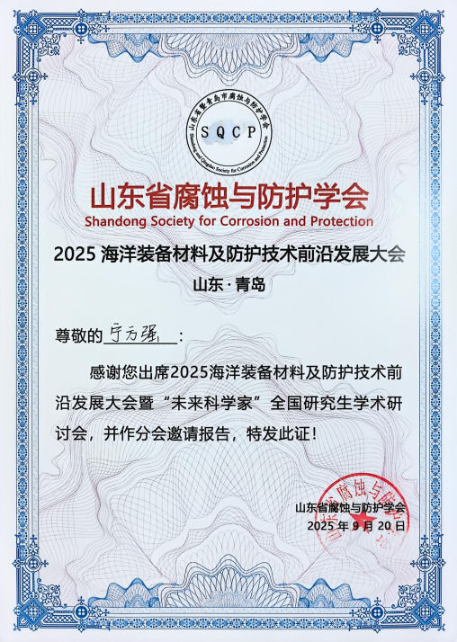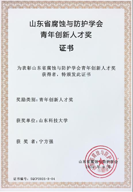 2025年9月19-21日,山东省腐蚀与防护学会主办的2025海洋装备材料及防护技术前沿发展大会暨“未来科学家”全国研究生学术论坛在青岛召开。大会伊始,学会公布了山东省腐蚀与防护学会2025年度科学技术奖评选结果,宁方强老师获山东省腐蚀与防护学会青年创新人才奖。