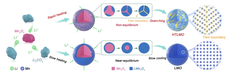 具有尖晶石结构的LiMn2O4作为一种重要的锂离子电池正极材料受到广泛关注。然而该材料在充放电过程中Mn2+的溶解以及Mn3+的姜-泰勒效应导致的晶格畸变,限制了其循环稳定性和倍率性能。在材料中引入孪晶缺陷被证明可以有效地提升多种锂离子电池正负极材料的电化学性能。该研究采用Li2CO3和Mn3O4前驱体,通过高温热冲击(HTS)技术成功制备了具有孪晶缺陷的LiMn2O4材料。HRTEM和固态7Li NMR证明孪晶缺陷被成功引入到了材料的结构中,且孪晶界面处的Li+的比例约为5%。在HTS过程中LixMnyO4颗粒中局域富锂相以及各向异性的成相过程可能是形成孪晶结构的主要原因。电化学测试表明通过HTS技术制备的具有孪晶缺陷的LiMn2O4表现出比传统技术制备的材料更优异的倍率性能。此外,该研究证明可通过HTS实现诸如元素掺杂等传统的改性方案并进一步提高材料的循环稳定性。
