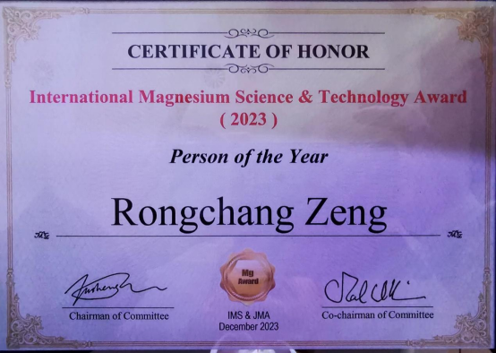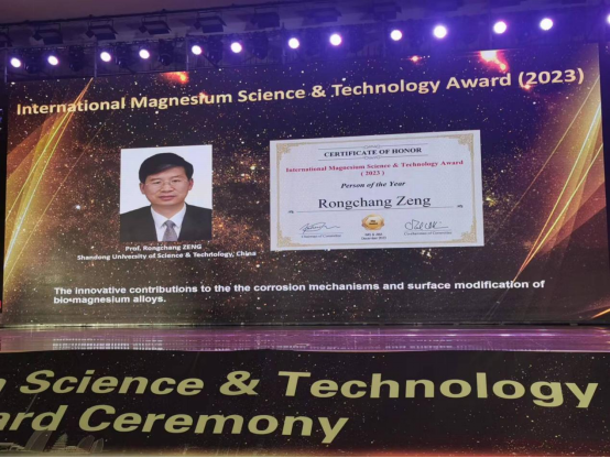 2023年12月11日-12日,2023年度国际镁科学技术奖颁奖典礼暨《镁合金学报(英文)》创刊十周年前沿论坛在河南省鹤壁市顺利召开。本次颁奖典礼由国际镁学会(International Mg Society)和《镁合金学报(英文)》(Journal of Magnesium and Alloys)共同主办。Beat365官网曾荣昌教授受邀参加此次颁奖典礼并获得2023年度人物奖。同时获得该奖项的还有美国加州大学圣巴巴拉分校机械工程学院Irene J. Beyerlein教授、河北工业大学副校长王慧远教授和德国亥姆霍兹Hereon研究中心表面科学研究所所长Mikhail Zheludkevich教授。此奖的获得是组委会对曾荣昌教授在医用镁合金腐蚀机制和表面改性领域相关工作的高度认可。