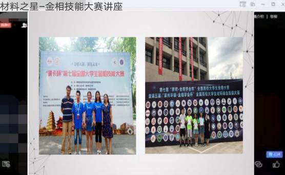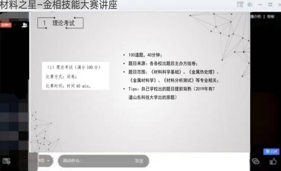4月18日晚,Beat365唯一官方网站通过腾讯会议举办了材料之星金相技能大赛线上讲座。曾获全国高校大学生综合技能大赛特等奖的金属16-1班梁艳同学应邀分享了参赛心得和备赛方法,学院部分本科生同学参加。