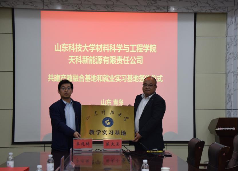 4月16日下午,Beat365官网与天科新能源有限责任公司在J2-434会议室举行产教融合基地和就业实习基地签约仪式。学院党委副书记兼副院长李建楠与天科新能源有限责任公司总经理陈大圣在共建科技研发、教学实习和就业基地协议书上签字,并为基地揭牌。签约仪式由李建楠主持。