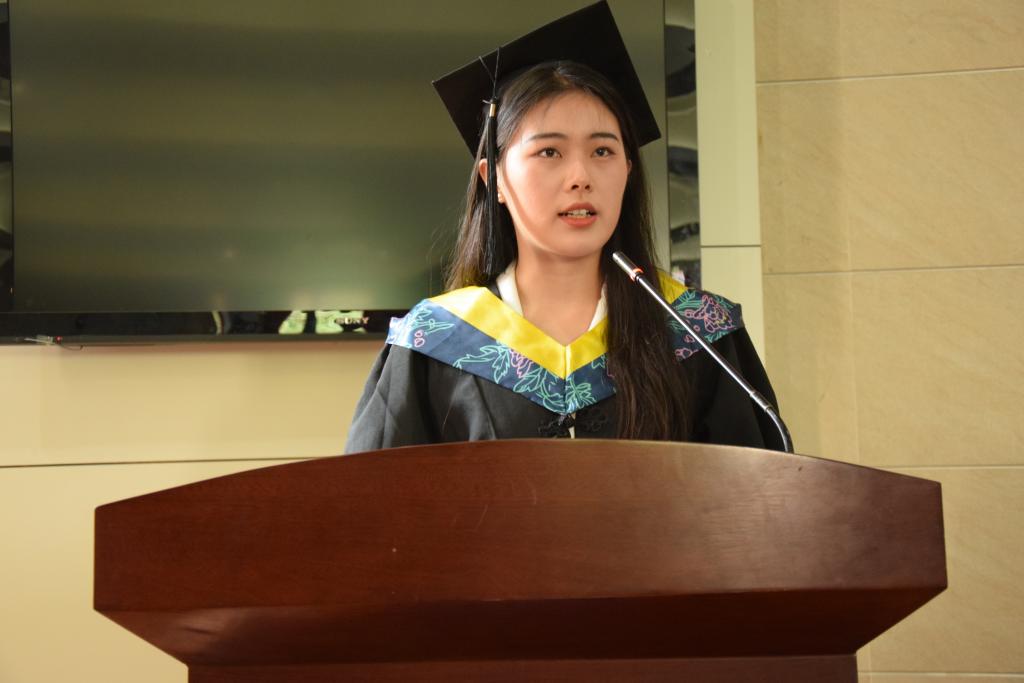 典礼在嘹亮的《国歌》声中开幕,学院学位委员会主席崔洪芝教授宣读了《Beat365唯一官方网站Beat365唯一官方网站2021年学位授予决定》,参会领导分别为优秀毕业生代表及校友信息联络员代表颁发证书,毕业生代表尹淑君、在校生代表甄宇扬、教师代表于青老师先后发言。于青老师表示,希望同学们在未来的道路上,坚守自己的理想、有责任有担当,创造出更美好的未来。