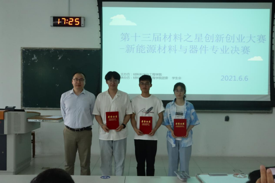 比赛由晋级的三支队伍展开角逐。整个过程分为限时答题环节、抢答环节、以及创新创业作品展示换届。经过激烈比拼,最终冠军为清华落榜生队、亚军为材料新星队、季军为新一突击队,新能源2020-2班路昱岳为本场比赛的“材料之星”。
