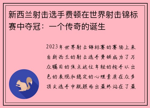 2023年世界射击锦标赛的赛场上,来自新西兰的射击选手费顿成为了万众瞩目的焦点。这位年轻的枪手以出色的表现和稳定的心理素质,在众多顶尖选手中脱颖而出,最终站在了最高领奖台上。这一刻,不仅是对他个人努力的肯定,更是新西兰射击运动史上的一座里程碑。搏冠体...