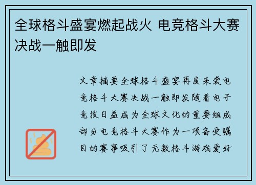 文章摘要:全球格斗盛宴再度来袭,电竞格斗大赛决战一触即发!随着电子竞技日益成为全球文化的重要组成部分,电竞格斗大赛作为一项备受瞩目的赛事,吸引了无数格斗游戏爱好者的关注。本文将从四个方面详细分析这一全球盛事,包括赛事规模的日益壮大、选手的全球化竞争、赛事背后的科技进步以及电竞格斗文化的蓬勃发展。通过...