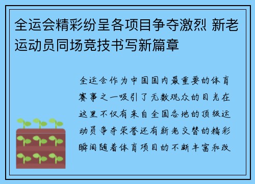 全运会,作为中国国内最重要的体育赛事之一,吸引了无数观众的目光。在这里,不仅有来自全国各地的顶级运动员争夺荣誉,还有新老交替的精彩瞬间。随着体育项目的不断丰富和改革,越来越多的运动员涌现出来,同时,也有一些老将依然在赛场上书写属于自己的传奇。本届全运会,竞技水平空前提升,各个项目的争夺异常激烈,新老...