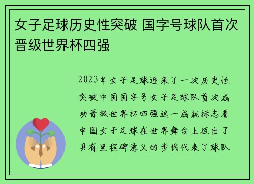 2023年,女子足球迎来了一次历史性突破——中国国字号女子足球队首次成功晋级世界杯四强。这一成就标志着中国女子足球在世界舞台上迈出了具有里程碑意义的步伐,代表了球队和球员们长期不懈努力的成果。本文将从四个方面对这一历史性突破进行详细阐述,分别是中国女子足球的崛起与挑战、世界杯赛事中的亮眼表现、核心球...