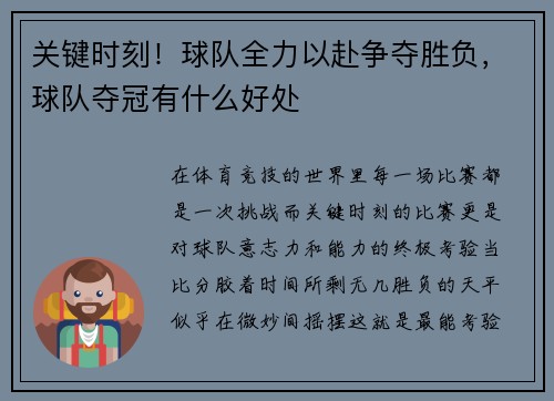 在体育竞技的世界里,每一场比赛都是一次挑战,而关键时刻的比赛更是对球队意志力和能力的终极考验。当比分胶着,时间所剩无几,胜负的天平似乎在微妙间摇摆,这就是最能考验一支球队成色的时刻。对于我们的球队而言,这场比赛不仅仅是一场普通的比赛,更是一次证明自己、争取荣誉的绝佳机会。 比赛开始前,球队的每一个成...