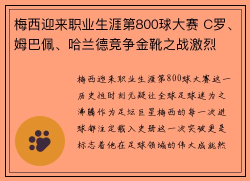 梅西迎来职业生涯第800球大赛,这一历史性时刻无疑让全球足球迷为之沸腾。作为足坛巨星,梅西的每一次进球都注定载入史册,这一次突破更是标志着他在足球领域的伟大成就。然而,这一壮举并非孤立存在,因为在金靴之战中,梅西并不是唯一的争夺者。C罗、姆巴佩、哈兰德等一众足球巨星也在本赛季的欧洲赛场上表现出色,争夺着个人荣誉的顶峰。本文将从四个方面来详细分析梅西职业生涯第800球的意义,以及C罗、姆巴佩、哈兰德竞争金靴的激烈局势。