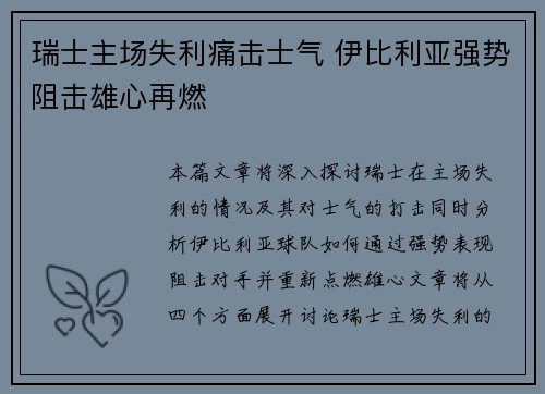 本篇文章将深入探讨瑞士在主场失利的情况及其对士气的打击,同时分析伊比利亚球队如何通过强势表现阻击对手并重新点燃雄心。文章将从四个方面展开讨论:瑞士主场失利的背景与影响、士气打击对球队表现的具体影响、伊比利亚球队的强势反击与策略、以及这些因素如何共同塑造了球队的未来前景。每个部分将从多个维度分析,力图全方位解读这一事件对瑞士和伊比利亚球队的深远影响。